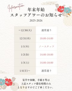 見学や体験、手続き等は上記スタッフ滞在時間のみとなりますので