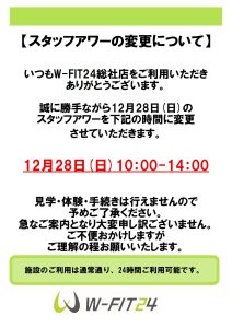 12月28日(日)急遽ではありますがスタッフアワーを変更させていただきます。